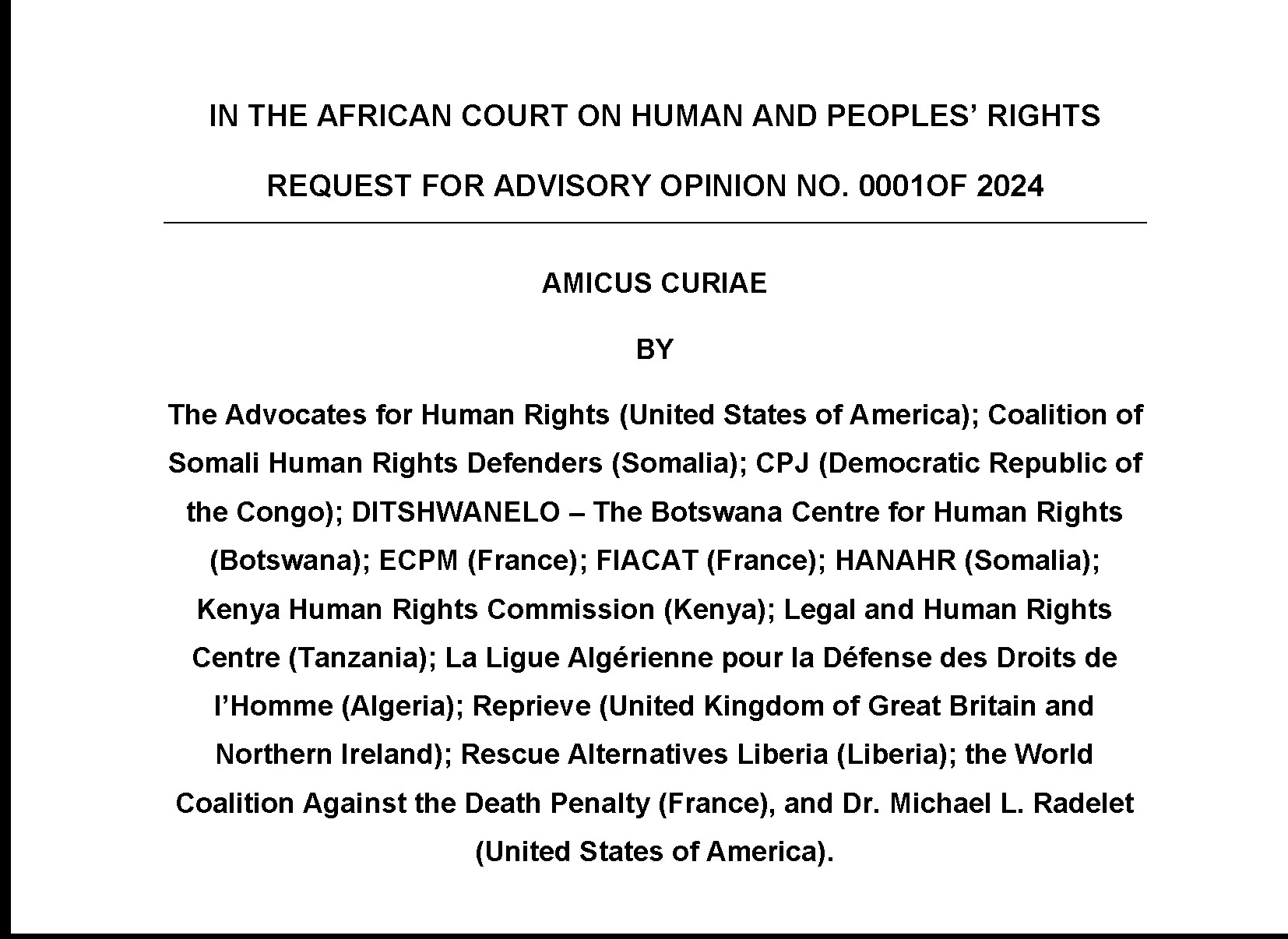 On October 10, 2024, The Advocates for Human Rights held a webinar to announce the launch of its amicus brief in the context of the theme for World Day Against the Death Penalty: The Death Penalty Protects No One. One of the pro bono attorneys who drafted the amicus brief presented its primary arguments and an expert on the African Court provided additional context about the strategic litigation and the role of amicus briefs in shaping the Court's jurisprudence.
