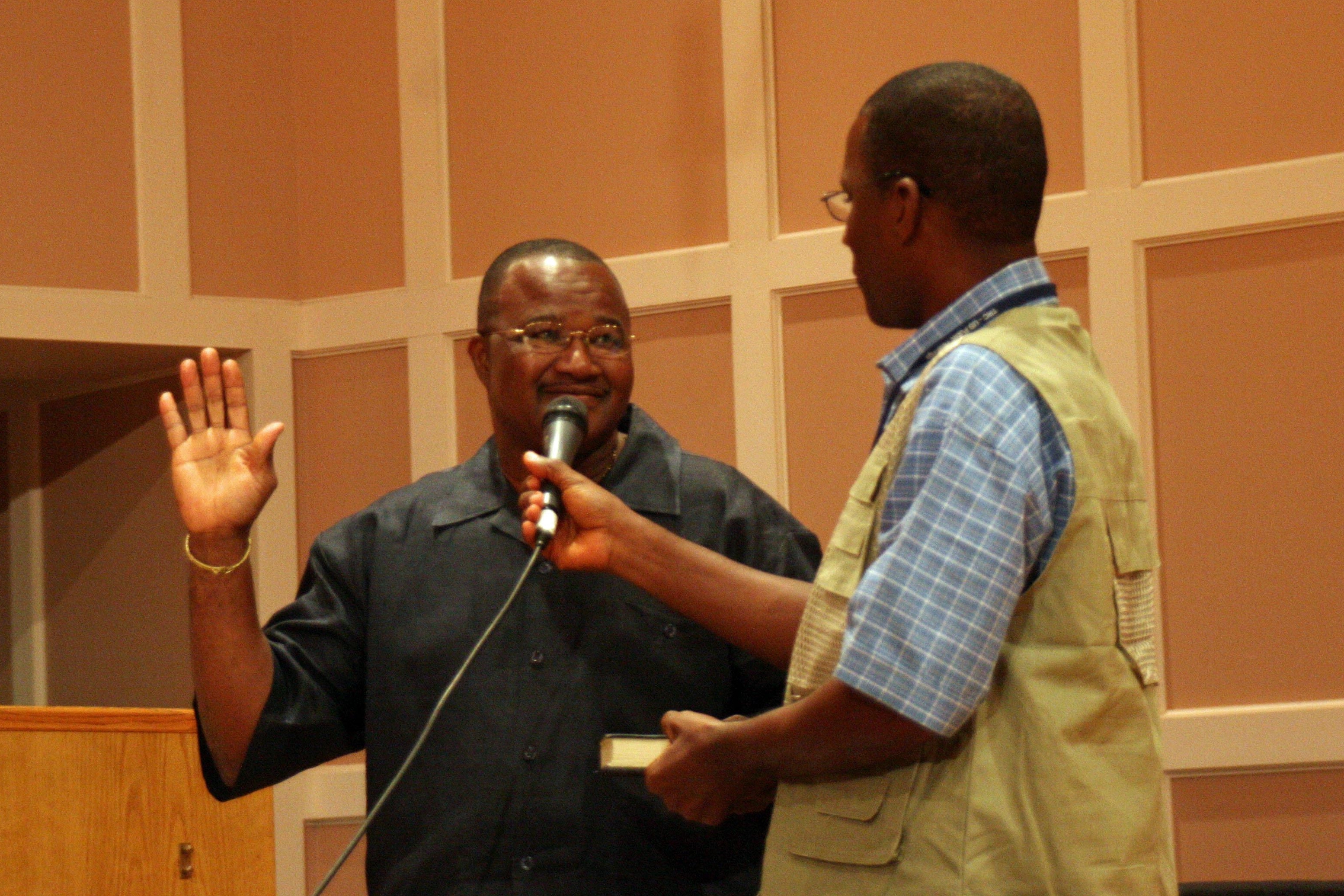Liberian Consul General from Chicago, Alexander Gbayee, testifying at the first ever public hearings of a truth commission held in a diaspora, the Diaspora Hearings of the Liberia Truth and Reconciliation Commission, at Hamline University in St. Paul, MN, June 2008