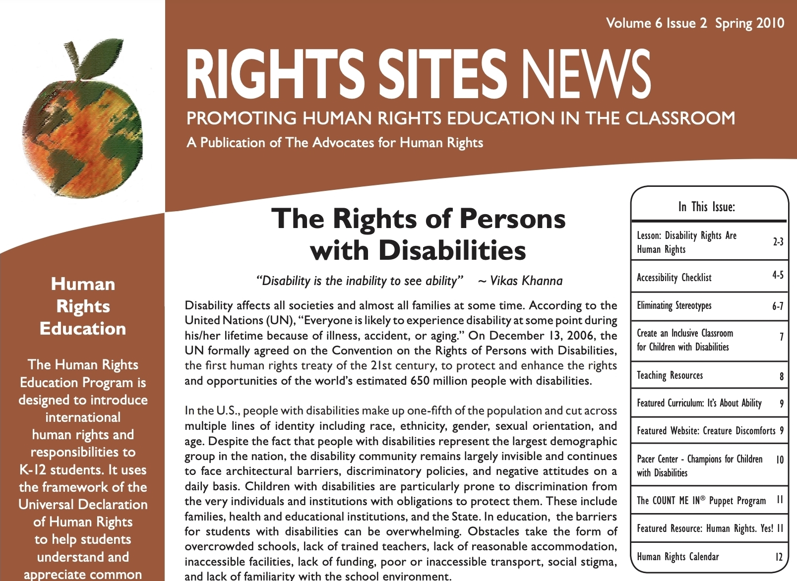 Spring 2010 edition of The Advocates' human rights education newsletter dedicated to the promotion and advancement of the rights of persons with disabilities by helping teachers create more positive and inclusive learning environments for all children.