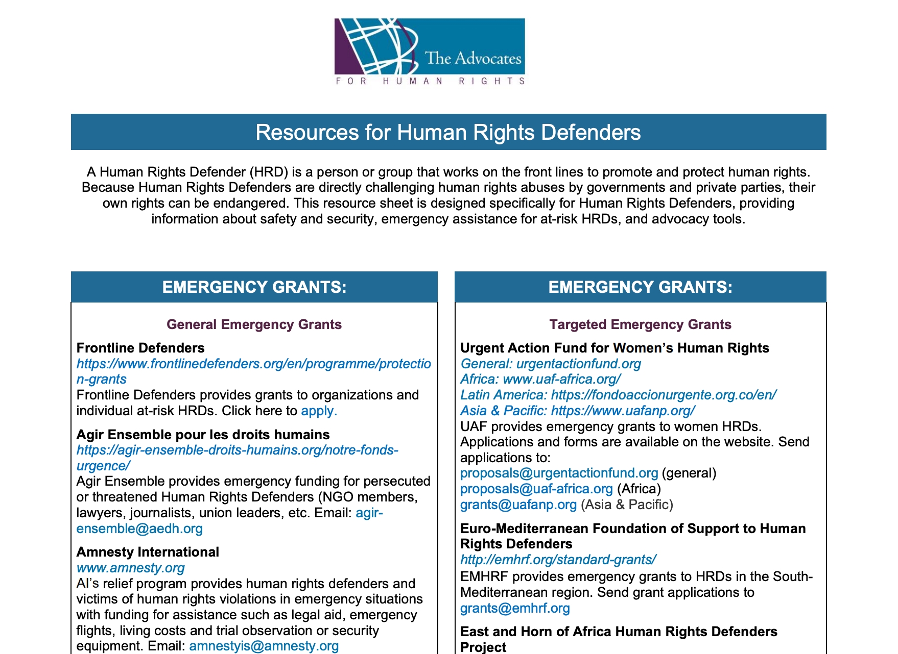 information about safety and security, emergency assistance for at-risk HRDs, and advocacy tools.