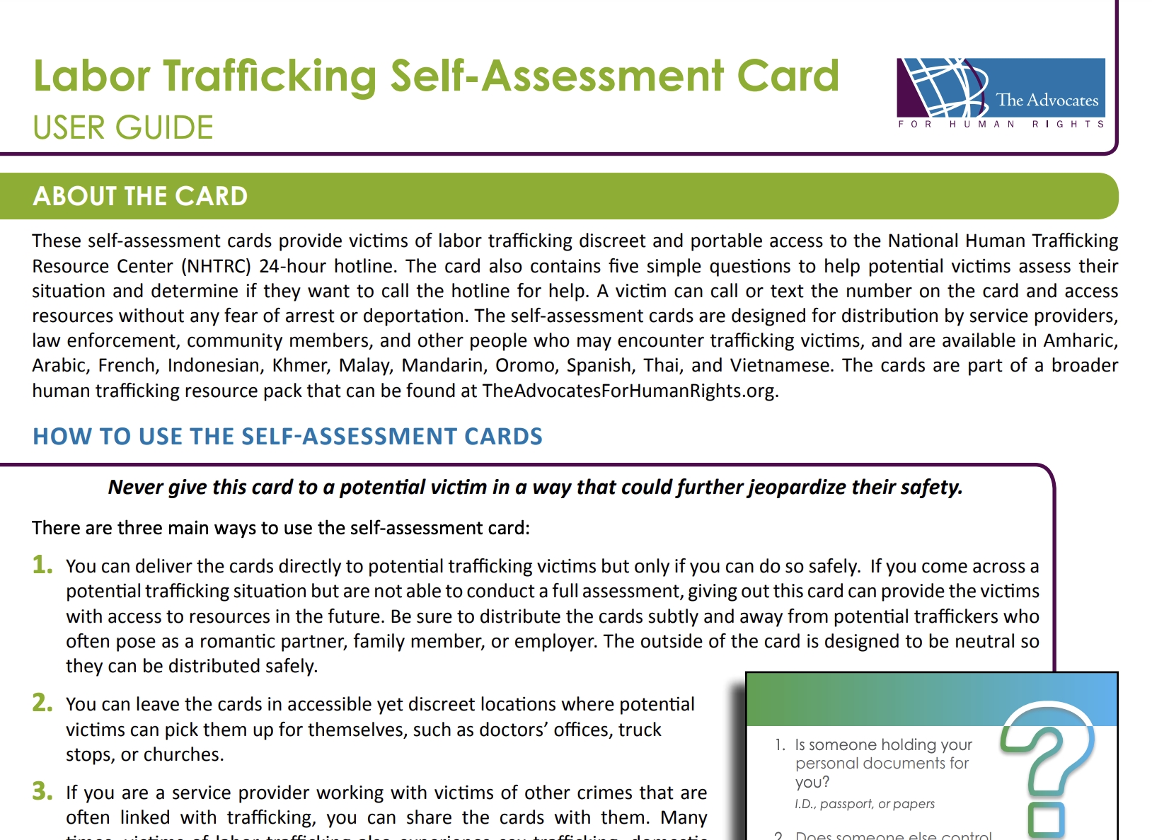 The card contains five simple questions to help workers assess their situations and determine if they want to seek help and helps workers connect with the National Human Trafficking Resource Center 24-hour hotline (888-373-7888) where they can find out about help in their area.