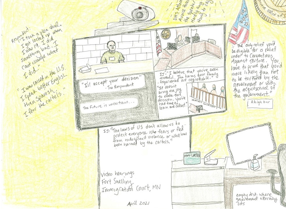 Court observers complete a two-page observation form for each observed hearing. Observers record demographic information such as gender, country of origin, and primary language; and objective information such as the presiding judge, counsel for the Department of Homeland Security (DHS), whether the person was represented, type of relief (defenses to deportation) being sought, bond requests and decisions, and criminal history. Observers also report subjective impressions about the person’s ability to understand and participate in the hearings, the treatment of the detained person, and the fairness of the process and outcome of the hearing. All collected observations are entered by volunteers into a database. Approximately every six months, the data are analyzed, and a stakeholder report is written. This report covers observed hearings at the Fort Snelling Immigration Court, in Minnesota, between September 1, 2020, and March 31, 2021.